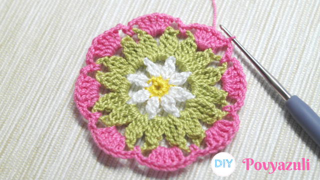 4 step. Change color of yarn (dark pink). Make 1 sl st in 2 ch sp, 3 ch, 4 dc in same 2 ch sp, 2 ch, 1 sc in 3 ch sp, 2 ch, (5 dc in 2 ch sp, 2 ch, 1 sc in 3 ch sp, 2 ch) - repeat around. At the end of the row make 1 sl st in 3rd ch.